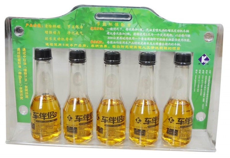 高科牌車伴侶汽油清凈劑(第四代燃油寶)是由兩種不同的高分子聚醚醇酰胺類混合物配以多種輔助劑復(fù)配而成,其中的重要成分是兩種不同的特種結(jié)構(gòu)聚醚胺和聚醚醇酰胺,一種分子量約1000的合成聚醚胺具有非常強(qiáng)的清潔去垢作用,另一種分子量約2000的改性聚醚醇酰胺具有更高的養(yǎng)護(hù)保潔作用,同時(shí)具有減少汽油摩擦磨損的性能。這兩種特殊結(jié)構(gòu)的聚醚胺都具有很好的抗氧化性和清凈分散性,對膠質(zhì)化合物、微小顆粒具有極強(qiáng)的吸附及捕捉能力,可阻止其進(jìn)一步的氧化和聚集,從而可大大減少汽油中沉渣的形成,與汽油的互溶性良好,且同時(shí)具有很好的防腐性能。該產(chǎn)品既具有一般PIBA(一般清凈劑常用的聚異胺)的清潔作用,同時(shí)分子量更大的胺熱穩(wěn)定性好,對于發(fā)動機(jī)燃燒室前的油路系統(tǒng)具有更高的養(yǎng)護(hù)作用。與PIBA類的產(chǎn)品由于熱穩(wěn)定性更強(qiáng)、燃燒不易于燃燒室形成二次積炭不同的是:這兩種特殊的胺類產(chǎn)品在隨著油氣混合物進(jìn)入燃燒室,同時(shí)完成了對燃燒室積炭的軟化、分散、剝離、清除,后隨著油氣混合物一起燃燒,不會產(chǎn)生新的積炭等,終通過發(fā)動機(jī)排氣系統(tǒng)排出,因而該產(chǎn)品是目前對燃燒室清潔效果、安全的無灰添加劑。