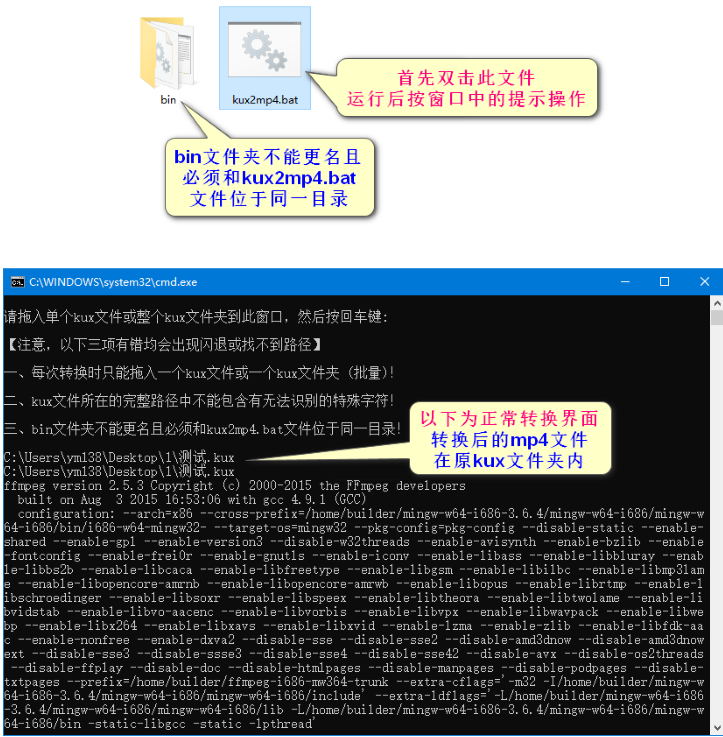 三、bin文件夾不能更名且必須和kux2mp4.bat文件位于同一目錄!