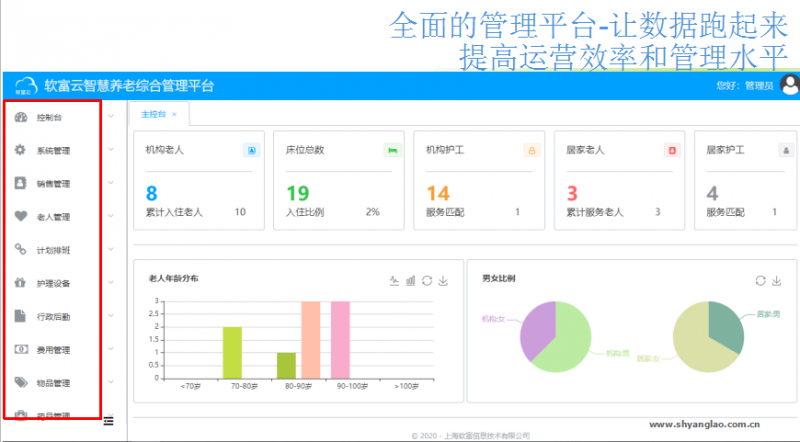 軟富云智慧養老提供智慧養老管理平臺和智能養老設備。平臺整合有包含基礎資料、庫存管理、老人管理、排班管理、設備管理、費用管理、醫療管理、機構內管理等功能模塊。平臺包括從老人成為潛在客戶開始到老人離院各個環節,通過明確的職能安排,合理進行資源配置,有效節約成本,提升效率。