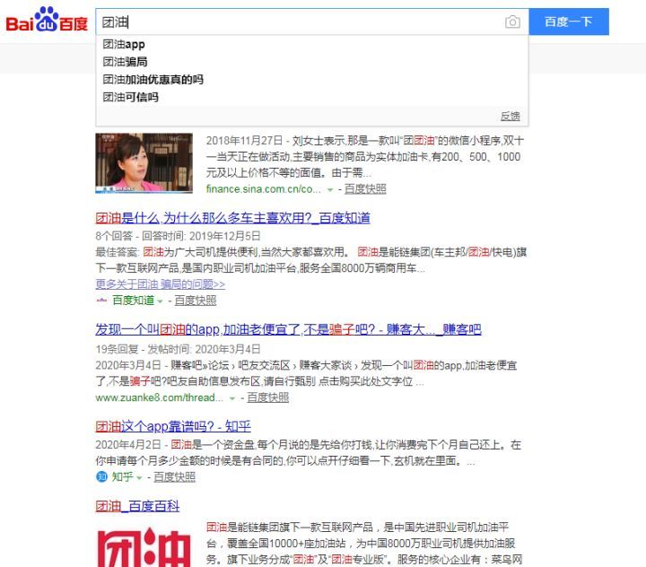 在網(wǎng)絡上搜索團油兩個字可以發(fā)現(xiàn),冒出來的關聯(lián)詞都是''團油騙局'',''團油加油優(yōu)惠騙局''等。
