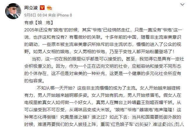 隨后,關于“娘炮”的話題還引發了網民的集體大討論。盡管有許多國人覺得男孩子就應該剛烈,化著濃妝帶著美瞳的偶像藝人,只會教壞孩子,腐蝕咱們國家的風氣。但也有犀利的看法指出,男孩子必需剛烈只是時代審美的問題,在多元化的今日各種審美都應該獲得包容和尊重,誰也不能說“娘炮”風的男孩子就不能做出貢獻了。