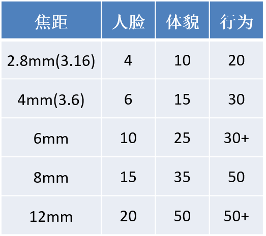 對于監(jiān)控距離而言,不同的人監(jiān)控的目標(biāo)不一樣,對應(yīng)的監(jiān)控范圍就不一樣。監(jiān)控人臉、監(jiān)控人的體貌、監(jiān)控人的行為這是三種完全不同的概念。我們以常見的200W機型為例,針對不同的監(jiān)控目標(biāo),IPC焦距與監(jiān)控距離的關(guān)系如下: