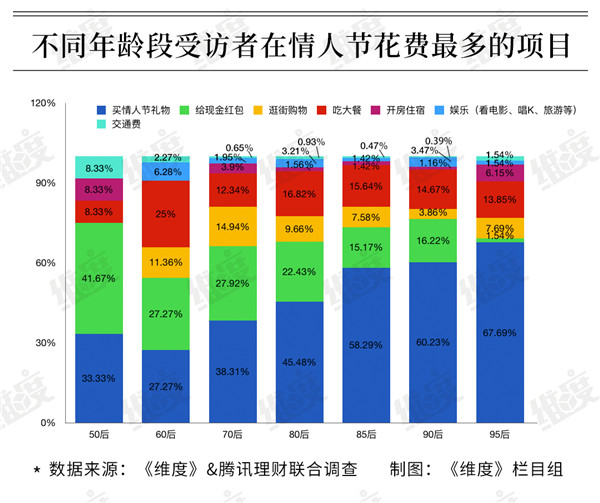 調查中,83.42%受訪情侶(夫妻)都需要為情人節花錢,其中花費500到1000元的最多,占比超兩成。從年齡段來看,新生代95后已成為情人節消費的主力軍,僅4.48%沒為過節花錢,其超千元的花銷也位居前列;以50后為代表的老年群體,在情人節花費上,呈現出兩極分化的現象,在所有年齡段中,不花錢的50后最多,但花費超過3000元乃至萬元的也遙遙領先;相反,70后是對過節最不感冒的群體。