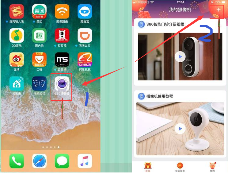 第二步,開始綁定門鈴,打開“360攝像機”,首先點開右上角“+”