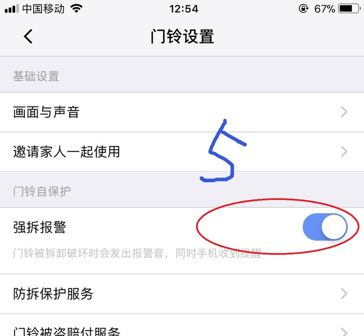 連接配置之后,我們到手機端開啟“強拆報警”,這樣以后如果有人偷拆時,門鈴會發出警報,手機端也會有提示!