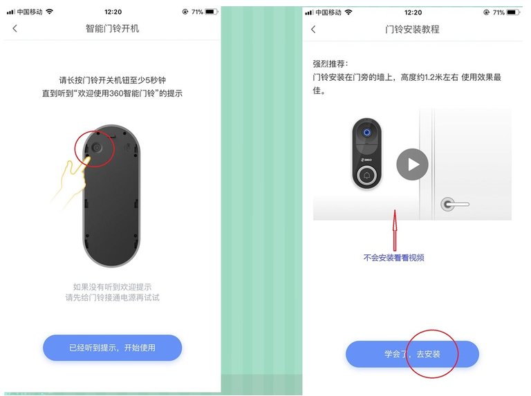 看到門鈴主機背面的開關機按鈕吧,長按,直到聽到提示音:“歡迎使用360智能門鈴”,這時,門鈴與基站連接成功!這個時候才算是完成了連接配置,上邊這兩步,缺一不可!