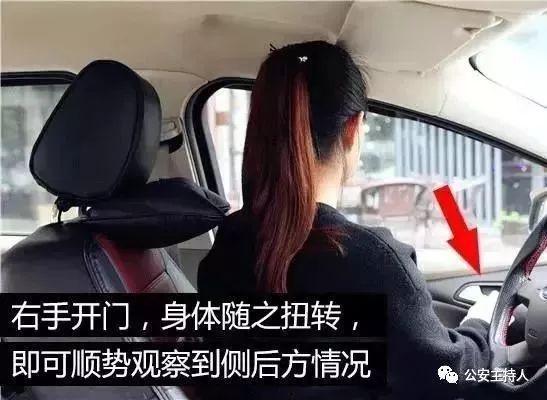 ◆ 開車門用離車門較遠(yuǎn)的手開(即左邊的人用右手,右邊的人用左手),這樣會“強迫”自己有一個轉(zhuǎn)體動作,以更好地觀察后方情況。