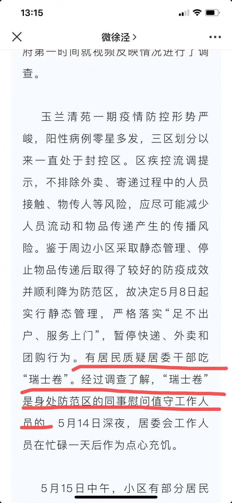 我是上海玉蘭清苑的居民。我們就是網傳“居民吃泡面居委吃瑞士卷”的小區。我簡單整理了一下我們小區事件始末。至于“瑞士卷”事件,最初視頻是由一位市民拍的,今天凌晨上海青浦徐涇官方平臺發了情況說明,說“瑞士卷”是身處防范區的同事慰問值守人員的。拍攝者據傳已被做出行政拘留5日的處罰,疫情后執行。我們居民也整理了玉蘭清苑這段時間發生的事情。