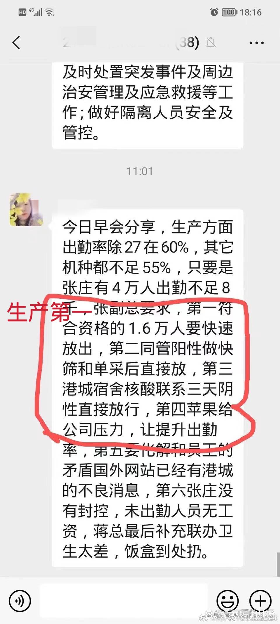 這么拖延和敷衍的處理方式,只會(huì)使事情變得更糟糕,果然,最不想看到的事情還是發(fā)生了,有一名菁干班成員抗原檢測(cè)兩次都為兩道杠。該成員曾經(jīng)在群里反映過(guò)自己的住宿問(wèn)題,無(wú)處可去,也表明自己身體不舒服,但是最后敷衍解決,在一個(gè)男寢打了地鋪。最無(wú)語(yǔ)的是他從上午都說(shuō)自己陽(yáng)性,直至下午都沒做上單采,到下午很晚的時(shí)候才被人拉走,拉走以后晚上也沒做上核酸。今天他們同宿舍的也有人抗原檢測(cè)出現(xiàn)了異常,不知道他們?cè)趺刺幚淼?,我只知道他們宿舍有一個(gè)人今晚住在了廠區(qū)倉(cāng)庫(kù)中。