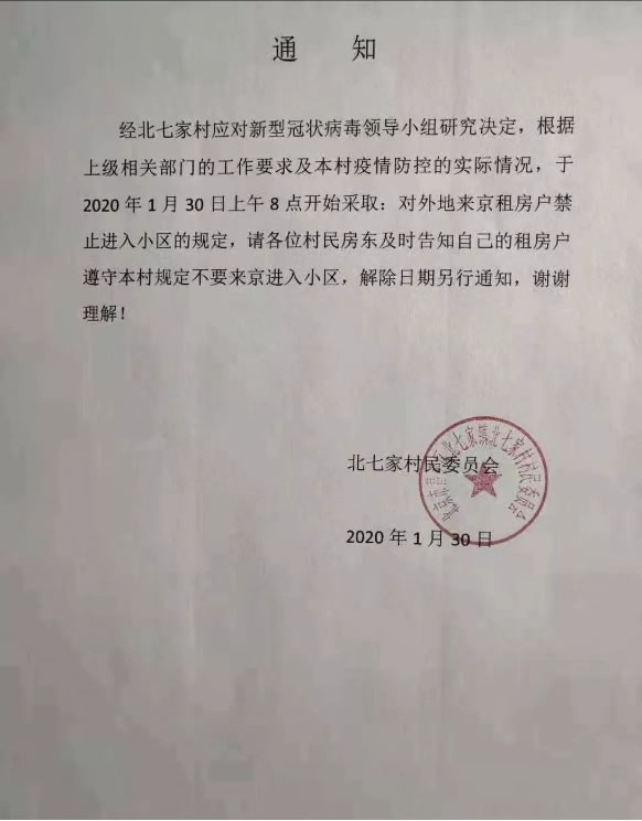 1月31日,北京市政府發(fā)文稱,“除必需行業(yè)外,各企業(yè)2月10日上班”,將迫在眉睫的返京大潮又往后推遲一個(gè)禮拜。只不過,這個(gè)文件仍然為企業(yè)要求員工返京彈性工作留有余地。已經(jīng)回京的上班族,已有不少人已經(jīng)在外流浪數(shù)日。陸續(xù)有北七家等地的房客被租住小區(qū)拒之門外,據(jù)不完全統(tǒng)計(jì),這些小區(qū)當(dāng)中的大多數(shù)都由村委會(huì)管理,這類強(qiáng)調(diào)“村民自治”的小區(qū),自認(rèn)為在社區(qū)管理層面有較大的自由度。他們對(duì)房客提出了要求,“自行在外隔離14天”,“14天后出示三甲醫(yī)院出具的健康證明”。