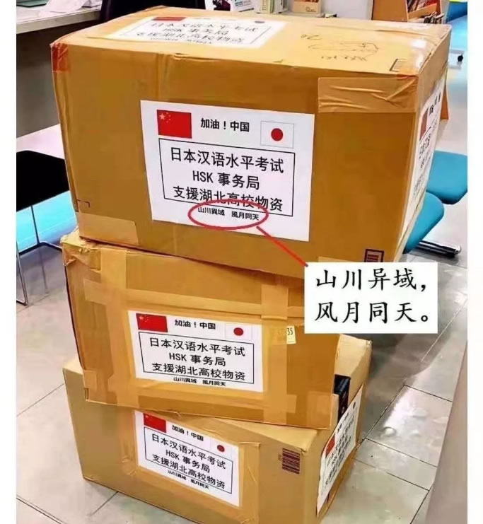剛才在微博上看到一張照片,拍的是捐給武漢的三箱物資,上面貼了張標(biāo)簽,“日本漢語水平考試考試HSK事務(wù)局支援湖北高校物資”,上面還有一行字,寫著“加油!中國”,下面還有一行小字,“山川異域,風(fēng)月同天”。這兩個(gè)詞突然就擊中了我,它們似乎傳達(dá)出來的美好情感和復(fù)雜情緒,讓處在眼下境地中的我,愣了好一會(huì)兒。
