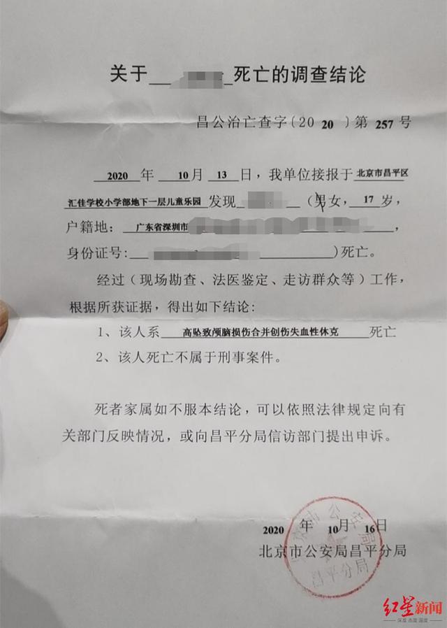 根據(jù)田先生提供的一張由北京市公安局昌平區(qū)分局出具的死亡調(diào)查結(jié)論顯示,10月13日,該局接報于北京市昌平區(qū)匯佳學校小學部地下一層兒童樂園發(fā)現(xiàn)17歲的小田死亡,經(jīng)過(現(xiàn)場勘查、法醫(yī)鑒定、走訪群眾)工作,根據(jù)所獲證據(jù),得出結(jié)論:該人系因高墜致顱腦損傷合并創(chuàng)傷失血性休克死亡;其死亡不屬于刑事案件。