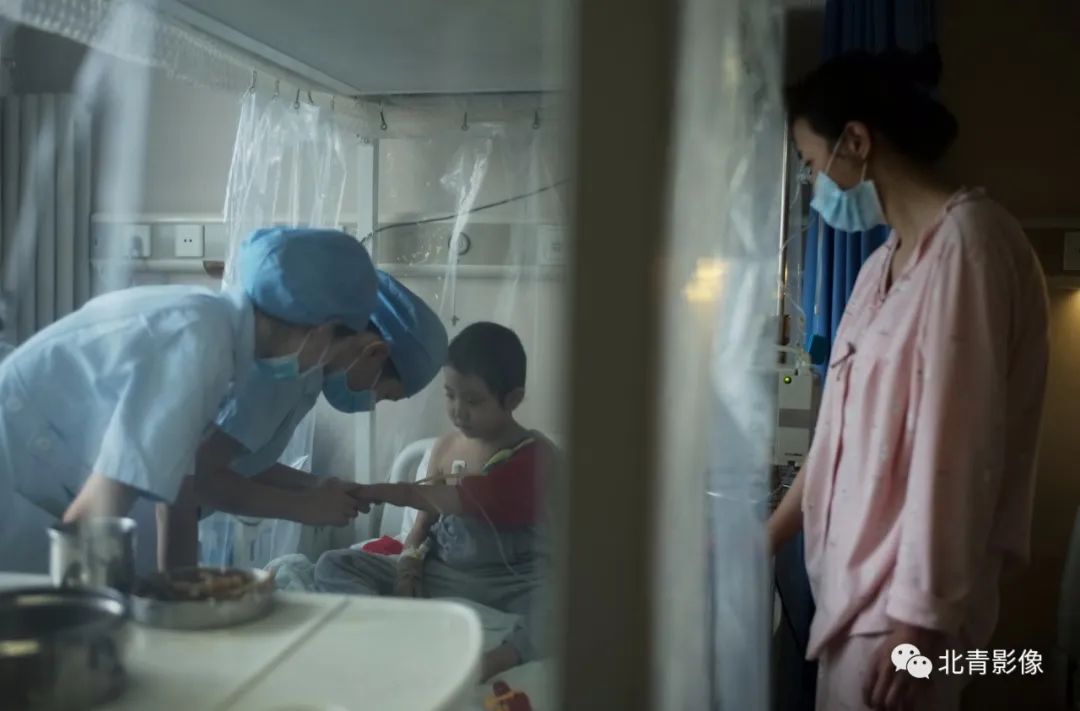 輸液管五六天就要換一次,小奕卜的血管細不好尋找,護士過來耐心施針。媽媽在“罩子”外只能看著。
