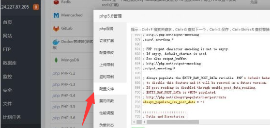2、如果你不想升級7.2習慣使用php5.6版本的話你只有開啟。找到你安裝好的PHP,點擊設置,修改配置文件,查找 always_populate_raw_post_data,找到它之后去掉前面的分號保存即可。
