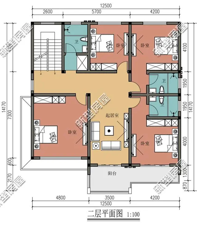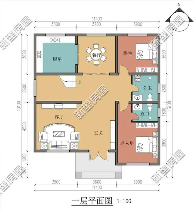 第4套:雙入戶門+觀景露臺+多臥室,9×14米新中式戶型,主體預算30萬