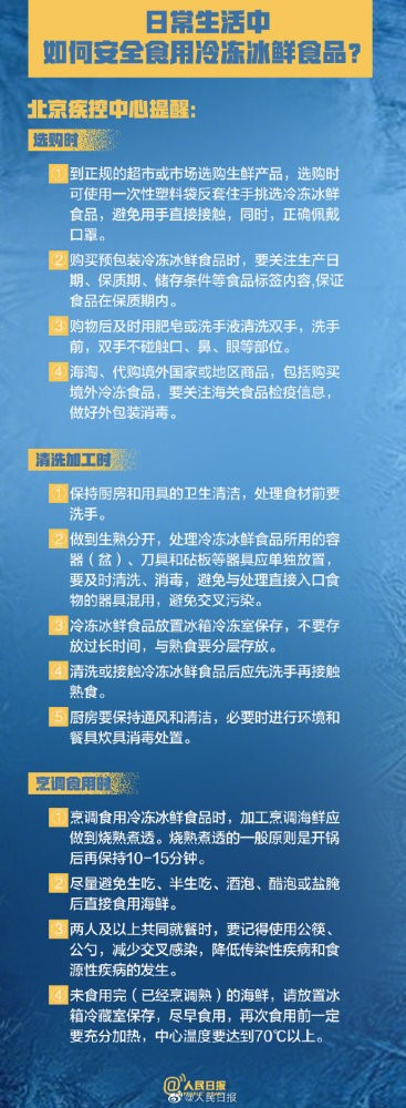 北京市疾病預(yù)防控制中心針對(duì)如何安全選購(gòu)、食用冷凍冰鮮食品提出了三方面的建議: