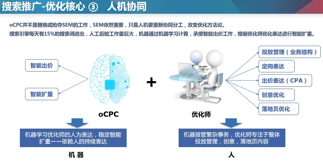 機器學(xué)習(xí)優(yōu)化師的人為表達,穩(wěn)定智能擴量,依賴人的持續(xù)表達,機器接管繁雜事務(wù),優(yōu)化師專注于整體投放管理、創(chuàng)意和落地頁優(yōu)化。