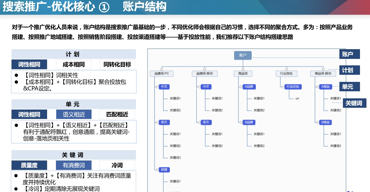 ②單元層級:關(guān)注詞性相同、語義相近、匹配相近,有利于通配符飄紅,提高關(guān)鍵詞創(chuàng)意、落地頁相關(guān)性;