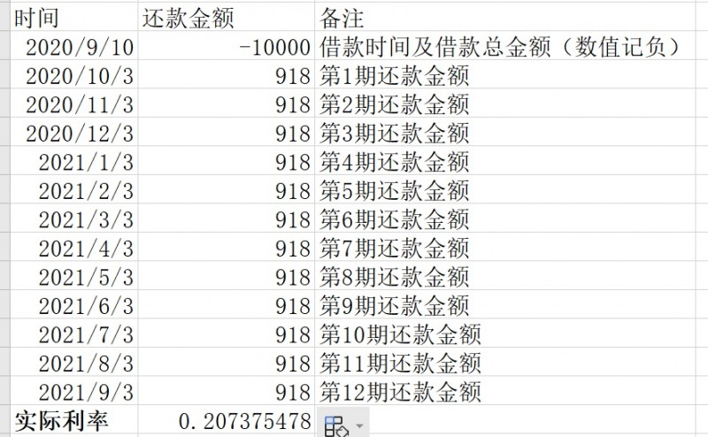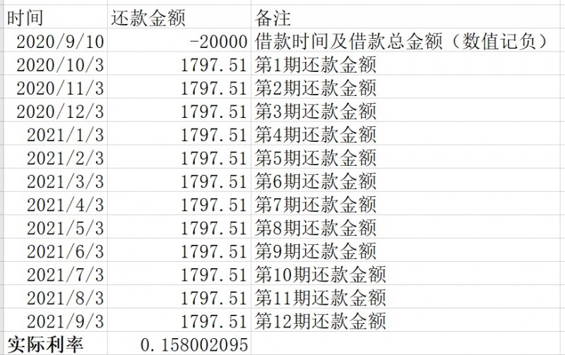 左邊一列,輸入還款日期;右邊一列,在開始借款日期一行,輸入借款總額(負值),在下面的空白行輸入每期還款金額(正值),最終可以得到結果(每期還款額取自軟件顯示需還款金額):