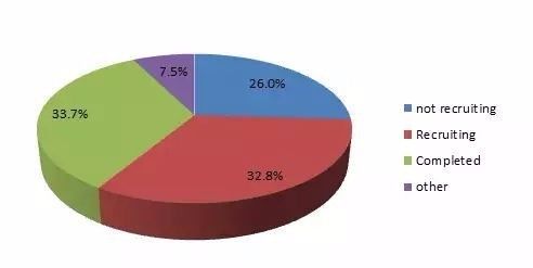 從臨床研究的所處階段的情況來看,根據(jù)可以獲得相關(guān)數(shù)據(jù)的558項臨床研究結(jié)果分析,可以發(fā)現(xiàn)已經(jīng)完成和正在開展的臨床研究各占1/3(表2)。