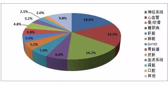 從治療的疾病種類來看,間充質(zhì)干細(xì)胞的臨床研究涉及上百種疾病(表3)。將這些疾病按照器官系統(tǒng)分類,可以發(fā)現(xiàn)神經(jīng)系統(tǒng)、心血管和骨科疾病是三類主要的研究領(lǐng)域,占比都在15%以上,總和超過一半。另外,糖尿病、肝臟、肺臟、胃腸道、皮膚和移植物抗宿主病(GVHD)的比例都在5%左右,是間充質(zhì)干細(xì)胞重要的臨床研究方向。