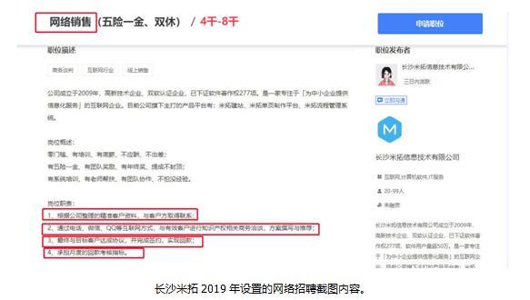回到正題,如果不作為,為什么要發這樣的招聘信息。請再看下面一份截圖,很正常的一個網絡公司招聘“網絡銷售”,而網絡銷售什么呢?其職責呢?看截圖內容,用4句內容描述工作職責,而其實就一個活嘛。根據公司整理的精準客戶資料,銷售非米拓的MetInfou組合版軟件。