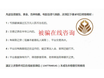 投資市場(chǎng)瞬息萬(wàn)變,騙局套路層出不窮。切勿輕信高回報(bào)與所謂的專家策略,夯實(shí)自身交易技術(shù),提高鑒別黑平臺(tái)、虛假公司的能力,才是保護(hù)自身財(cái)產(chǎn)安全最直接有效的方法!如果遇到類似情況,大家都可以和我司聯(lián)系,尋求專業(yè)的法律幫助!我司承諾維護(hù)權(quán)益不成功不收取任何手續(xù)費(fèi)用!我司專注投資虧損維護(hù)權(quán)益,只要你證據(jù)齊全,我們有絕對(duì)的能力和信心幫你拿挽回你的資金損失! 法律咨詢vx(13477040141(電話vx同號(hào)24小時(shí)在線))