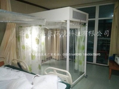 簡易潔凈病床頂部為空氣凈化系統(tǒng),四周以高透明度的防靜電塑膠垂簾圍護。工作時頂部的風機吸入環(huán)境空氣,經空氣凈化系統(tǒng)過濾成為潔凈空氣,再以層流的方式送入病床內。同時使病床內保持正壓,以阻止外部空間的塵埃粒子進入病床。