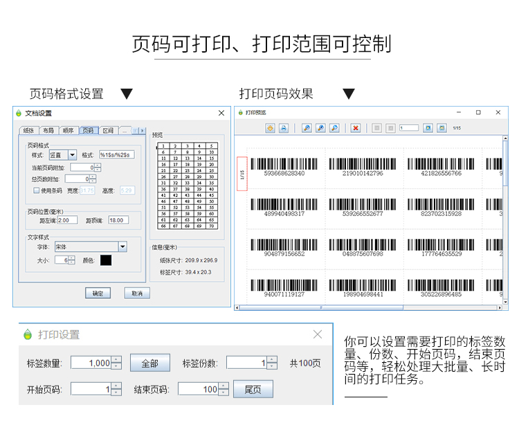 2、中瑯條形碼制作軟件可打印頁(yè)碼。頁(yè)碼位置(左、上、右、下)可選擇,頁(yè)碼字符串格式可自定義,頁(yè)碼字體顏色,大小可設(shè)置。