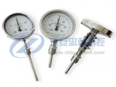 產品簡介 WSS系列雙金屬溫度計是一種測量中低溫度的現場檢測指針式儀表,其檢測溫度范圍在-80~500℃,主要用于直接測量各種生產過程中的液體、蒸汽和氣體介質的溫度。雙金屬溫度計表盤形式有軸向、徑向、135°角型和萬向之分,每種可根據用戶現場安裝于觀察位置選定。而雙金屬溫度計可以根據現場使用環境和控制需要又可以做成電接點雙金屬溫度計、耐震雙金屬溫度計、遠傳雙金屬溫度計和防爆電接點雙金屬溫度計等系列產品,由于其具有安裝維護方便、形式多樣等特點被廣泛應用于鋼鐵、冶金、石油、化工、環保、食品、水處理等需要對溫度的測量和控制的場合。 主要特點 現場顯示溫度,直觀方便;安全可靠,使用壽命長; 多種結構形式,可滿足不同要求。 工作原理 雙金屬溫度計是基于繞制成環性彎曲狀的雙金屬片組成。一端受熱膨脹時,帶動指針旋轉,工作儀表便顯示出所對應的溫度值。 技術參數 執行標準:JB/T8803-1998 GB3836-83 標度盤公稱直徑:60,100,150 精度等級:(1.0),1.5, 2.5(表盤60) 熱響應時間:≤40S 防護等級:IP55 角度調整誤差:角度調整誤差應不超過其量程的1.0% 回差:雙金屬溫度計回差應不大于基本誤差限的絕對值 重復性:雙金屬溫度計重復性極限范圍應不大于基本誤差限絕對值的1/2 溫度范圍的選擇:雙金屬溫度計作為指針式溫度計,其最大量程范圍的選擇應該為正常工作溫度的1.5~2倍 ,最小量程范圍應該是最大與最小值之和大于50℃ 測溫范圍