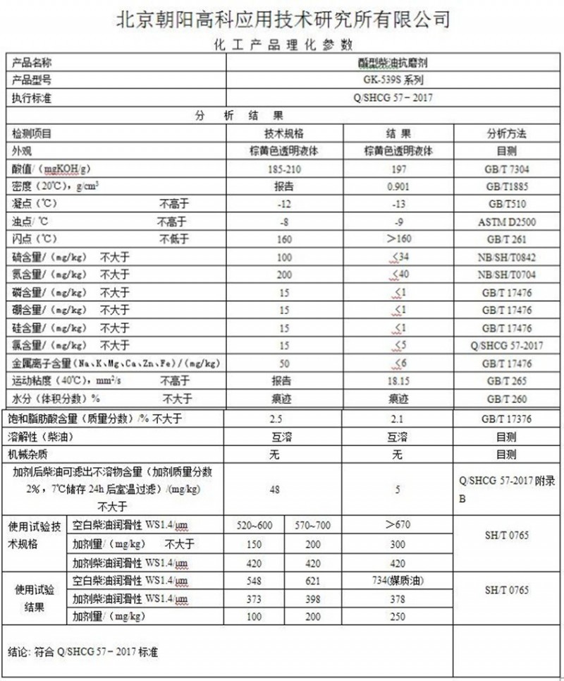 為應對國內柴油潤滑性差的現狀,我公司研發了GK-539S系列酯型柴油抗磨劑,從而有效應對柴油低硫化對柴油潤滑性能的要求,為柴油低硫化技術發展提供有效技術支撐。