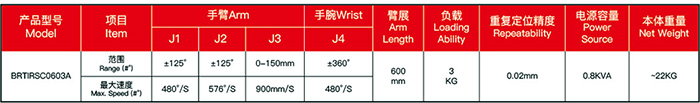 BRTIRSC0603A type robot is a four axis robot that developed for some monoto nous, frequent and repetitive long-term operations. The maximum arm length is 600mm. The maximum load is 3KG. Suitable for printing and packag Ing, metal processing, textile home furnishing, electronic equipment, and other fi elds. The protecti on grade reaches IP54The repeat positioning accura cy is 0.02mm.
