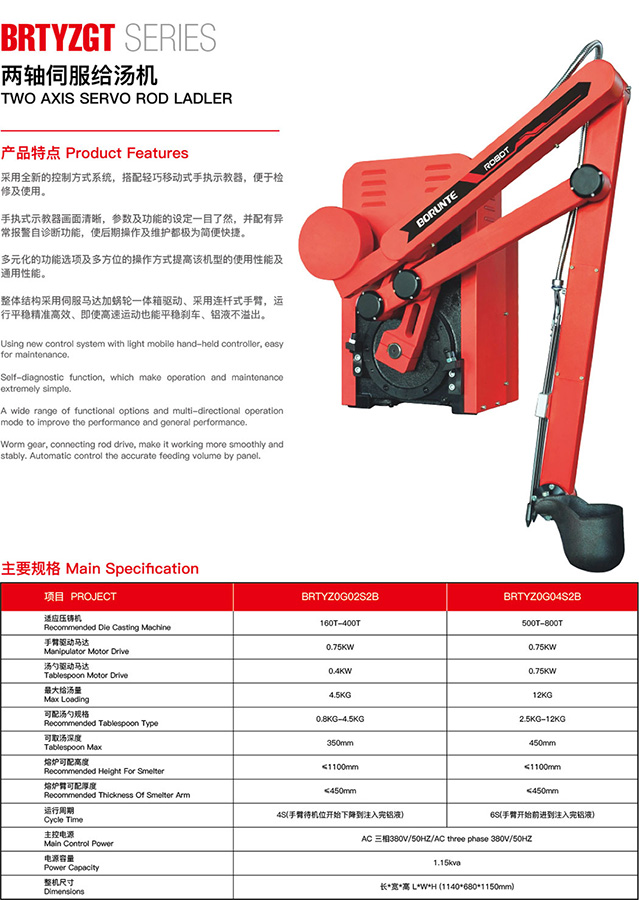 • 整體結構采用伺服馬達加蝸輪一體箱驅動、采用連桿式手臂,運行平穩精準高效、即使高速運動也能平穩剎車、鋁液不溢出。