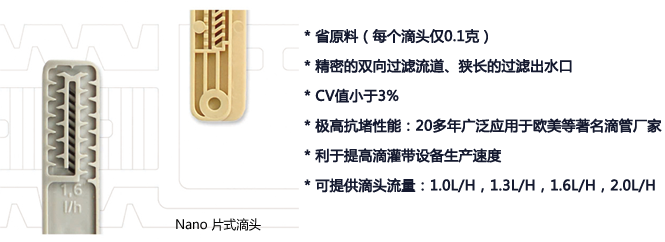 此滴灌生產線選用歐洲進口滴頭,最小重量僅0.1g(中國獨家代理,總經銷),青島新大成從歐洲引進并獨家代理銷售,采用高效注塑技術,生產高效內鑲滴灌管滴頭。