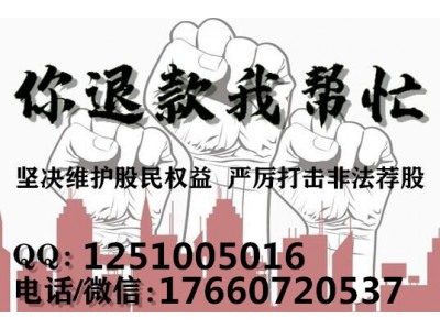 今年4月20日,該公司采用群營銷手段,同樣用高***票包裝其老師--以及接下來的計劃組,用托在群里不斷的夸大***,參與資格是繳納20萬元.但是我一直沒有同意,這個費用太高了,按照比例都有股票資金的30%了,這萬一有什么問題那損失就太大了.過了幾天,因為一直跟我聯系,在群里加的幾個人也勸我交錢,他們的實力很強,很輕松就能把交的費用***來.隨后的操作也是虧損.之前我在群里加上的幾個人現在一直也不吭聲.操作至今,股票賬戶依舊嚴重虧損中,被套的票深一支虧損50%不止,我們要求停止服務,退還我的該公司避而不談甚至直接不回復消息.跟我聯系的公司專員只是安慰我,讓我耐心一點,肯定可以***來的,但是提到退款那就不行,一切按照合同來.