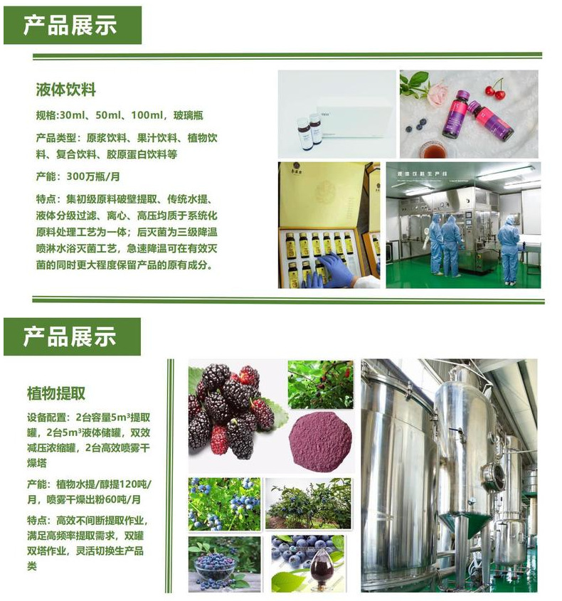 2、客戶提供原材料,工廠負(fù)責(zé)提取、灌裝、包裝等一站式服務(wù),為廣大種植基地提供深加工服務(wù)。