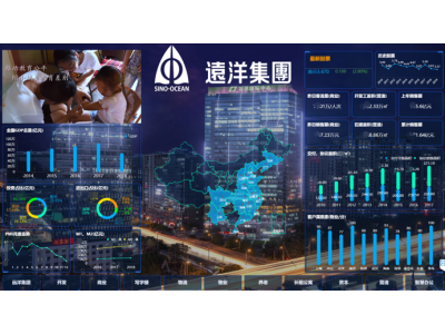 ,幫助遠洋構建了集團管理駕駛艙,將集團領導所關心的指標值例如:股價走勢,媒體報道,交付面積,商場客流,客戶滿意度等,用炫酷的圖形方式展示出來,并投射到董事長辦公室的六塊屏幕拼接而成大屏上,方便領導或客戶參觀,除了監控這些重要指標的變化,更提升了集團整體形象。