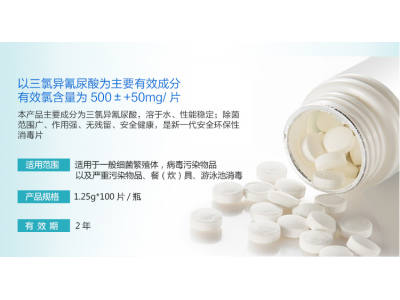 產(chǎn)品說(shuō)明:本品是以三氯異氰尿酸為主要有效成分的消毒片,有效氯含量為36%-44%,可殺滅腸道致病菌和化膿性球菌。