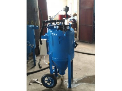 整機工作原理:壓縮空氣經過竹節接頭進入噴砂機壓力罐內,錐形封閉閥頂上,壓力罐密封。壓力管內的磨料流入砂閥,壓縮空氣在砂閥處與磨料混合,經噴砂管從高速噴嘴噴出,對工件進行處理。