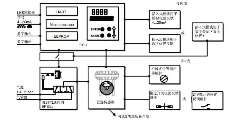 帶有后置氣動放大器的I/P模塊用來控制氣動執(zhí)行機構。I/P模塊通過調節(jié)三位三通閥將從CPU發(fā)出的定位電信號按比例轉換為氣動信號。執(zhí)行機構增壓或減壓的調整是連續(xù)的,因此可以達到極好的控制效果。當?shù)竭_設定點時,三位三通閥鎖定在中間位置,將耗氣量減到小。總共有四種不同的氣動輸出:單作用和雙作用,各有“故障-安全”和“故障-閉鎖”兩種型號可供選擇。