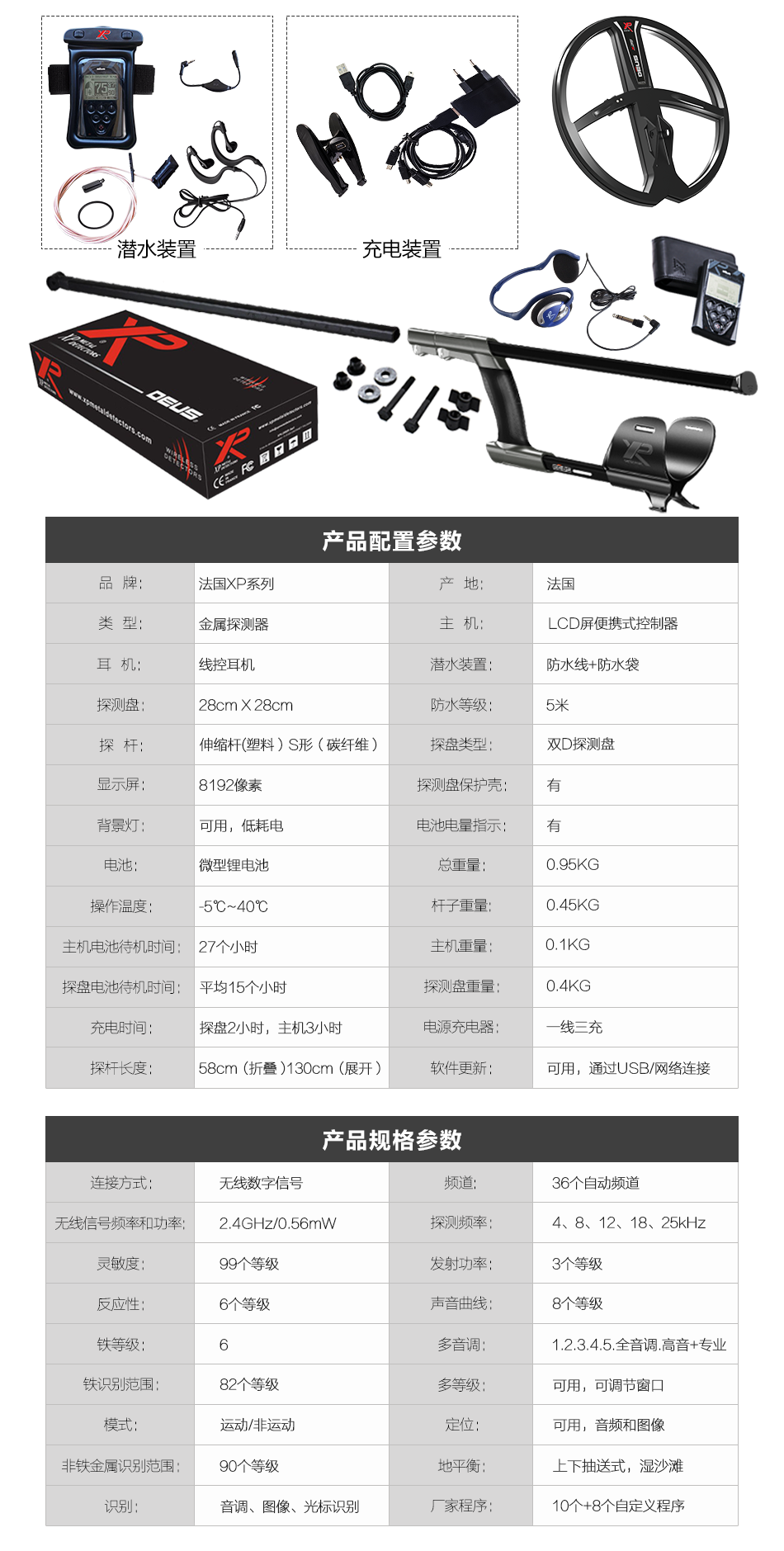 XP 地下金屬探測器是通過全球先進技術(shù)打造出來的強大、快速、輕便、簡潔的可控式數(shù)字探測器。機器自帶入門級模式以及專家模式。不管您是初學的探寶愛好者還是經(jīng)驗十足的探寶愛好者,XP地下金屬探測器會讓您自己做決定是否修改機器上的設(shè)定。強大的廠家預置程序可以讓大部分的操作者立即開始探寶,而經(jīng)驗十足的專業(yè)探寶人可以通過控制器界面選擇更先進的參數(shù)設(shè)置。