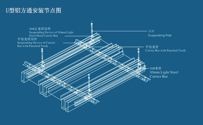 按設計要求根據安裝節點圖拉好線,把吊桿用膨脹螺絲固定在天花板上,一般吊桿的分布間距為1米-1.2米;規格大的鋁方通相應增加密度,吊桿的高度要統一。與結構一端的固定,常用的辦法是用射釘槍將吊桿或鍍鋅鐵絲固定。可以選用尾部帶孔或不帶孔的兩種射釘規格。如果用角鋼一類材料做吊桿,則龍骨也大部分采用普通型鋼,應用沖擊鉆固定脹管螺栓,然后將吊桿焊在螺栓上。吊桿與龍骨的固定.可以采用焊接或鉆孔用螺栓固定。把鋁方通龍骨固定在吊桿上,吊桿穿過方通龍骨上的孔螺母固定