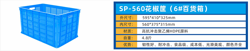 560花椒筐,又稱圓眼周轉(zhuǎn)筐。整體圓眼鏤空設(shè)計,外部設(shè)有加強筋,加厚加固。可堆碼層層卡緊,疊高牢固。適合倉庫、生產(chǎn)流水線、廠區(qū)內(nèi)部周轉(zhuǎn)。經(jīng)濟(jì)(可循環(huán)使用) 環(huán)保(保護(hù)生態(tài)環(huán)境) 衛(wèi)生(耐酸堿 防霉變 防潮 防蛀) 安全(無釘刺 無輻射 無味)便捷 (不需修理 易搬運)。