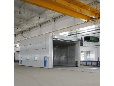 總之,整體移動噴漆房的設計目的是為了滿足磨削或噴涂較大工件的需要。一般每套對應2-3個排氣凈化站。當哪個工位上的工件需要噴漆時,房間移動到那個工位,其他工位可以繼續拋光。當室內的工件涂漆后,控制移動室移動到拋光工件工位。這種設計可以實現大型工件的不間斷連續涂裝。房屋為鋼結構,房屋的立柱下有兩個電動行走機構,行走機構沿地面軌道行走。移動房兩端安裝電動卷簾門。當房間行走時,門上升,當房間到達位置時,門著陸并關閉。門和行走機構由電氣控制部分連鎖控制。門升起后,房間可以移動和行走。