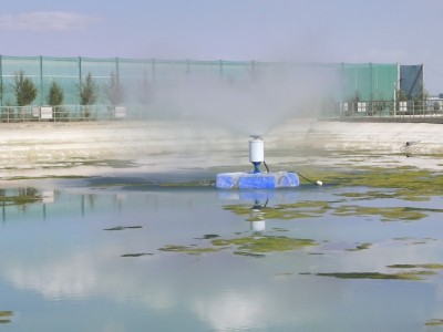 蒸發(fā)塘噴霧機(jī),電動機(jī)通過支撐柱安裝在浮臺上,電動機(jī)的動力輸出軸上設(shè)置有扇片,增壓水泵固定在浮臺下方,電動機(jī)外壁上固定有噴水裝置,增壓水泵通過水管與噴水裝置相連通,噴水裝置的出水口位于扇片的下方。本實用新型的有益效果在于:1、采用增壓水泵供水,噴水裝置的出水口位于扇片的下方,在扇片的作用下,水與外界環(huán)境接觸時間長,蒸發(fā)效果好。2、工程投資低、操作管理簡單、安裝拆卸方便、占地面積省等特點,可完全彌補(bǔ)自然蒸發(fā)塘的缺點。3、安裝在蒸發(fā)塘上,起到加強(qiáng)蒸發(fā)的作用,可增強(qiáng)蒸發(fā)效果14~30倍,蒸發(fā)同樣的廢水所需蒸發(fā)塘面積可降低到原來的1/10。