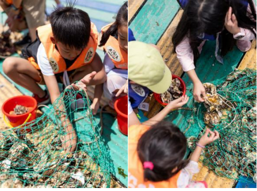 乘船登海上平臺(tái),拔地籠,親手收獲扇貝、牡蠣等海產(chǎn),午餐品嘗自己收獲的海鮮。