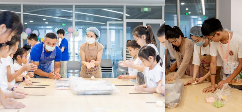 我們邀請(qǐng)了膠東傳統(tǒng)村落——沙龍王村的阿姨奶奶們教孩子們學(xué)習(xí)揉面、塑形等手藝,小小的面團(tuán),經(jīng)過(guò)孩子們靈巧雙手的搓揉,搖身一變,成了充滿童趣的小豬、兔子、烏龜、熊貓.....