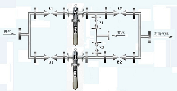 一備一用使用方法A過濾器使用①.打開A1 A2閥門,②.關閉B1 B2 Z1 Z2閥門,使用3天后A過濾器需要蒸汽滅菌時切換至B過濾器使用①.打開B1 B2,②.關閉A1 A2,③.打開Z1(蒸汽閥門) ④20-30分鐘后關閉Z1,同樣方式切換AB過濾器 交替使用,如有大疫情真空泵超負荷運行可以同時使用A B二臺過濾器①.打開A1 A2 B1 B2閥門,②.關閉Z1 Z2閥門