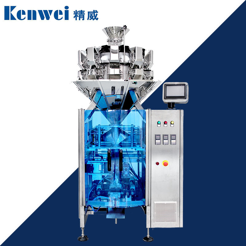 3、自動多頭秤和立式包裝機組合一體,秤量包裝一體PLC程序控制,全自動完成計量、充填制袋、打印日期、包裝輸出;
