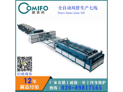康美風(fēng)全自動(dòng)風(fēng)管生產(chǎn)七線(歐式GDF法蘭風(fēng)管生產(chǎn)線)由四個(gè)料架,調(diào)平壓筋,沖方口,沖尖角,折邊,剪切,專利型升降轆骨機(jī) (可實(shí)現(xiàn)剪切,聯(lián)合角成型,直角骨成型三位一體),雙聯(lián)GDF法蘭成型機(jī),送料平臺(tái)(可選),液壓折邊合口機(jī)組成。采用全電腦PLC控制,觸摸屏操作,可根據(jù)操作要求設(shè)置任意尺寸進(jìn)行下料,該生產(chǎn)線最大加工速度為18米/分,精度為:長(zhǎng)度誤差± 0.5mm,對(duì)角線誤差為± 0.5mm, 標(biāo)準(zhǔn)開料架承重5噸,可根據(jù)客戶要求配套。可生產(chǎn)出“L”、“口”型帶咬口、TDF共板法蘭、折邊的風(fēng)管。全自動(dòng)風(fēng)管生產(chǎn)線占地面積小,直線型加工,生產(chǎn)效率高,適合規(guī)模化風(fēng)管加工。